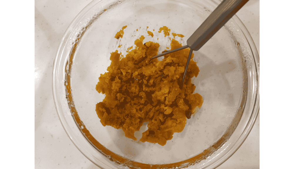 - 柔らかくなったかぼちゃを、フォーク又はマッシャーでつぶす。