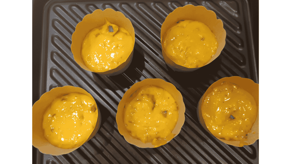 5.カップに生地を入れ、180℃に予熱したオーブンで約20分焼く。竹串をさして生地がつかなければ完成!