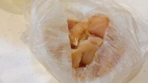 ポリ袋に入れて、塩こしょうと料理酒をよく揉みこむ。